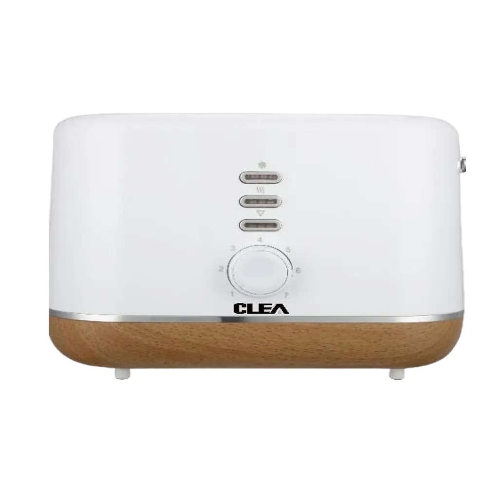 Compact two-slot toaster (720–850W) with 7-level browning, cancel/reheat/defrost buttons, auto-centering, anti-jam protection, and an integrated bun warmer.