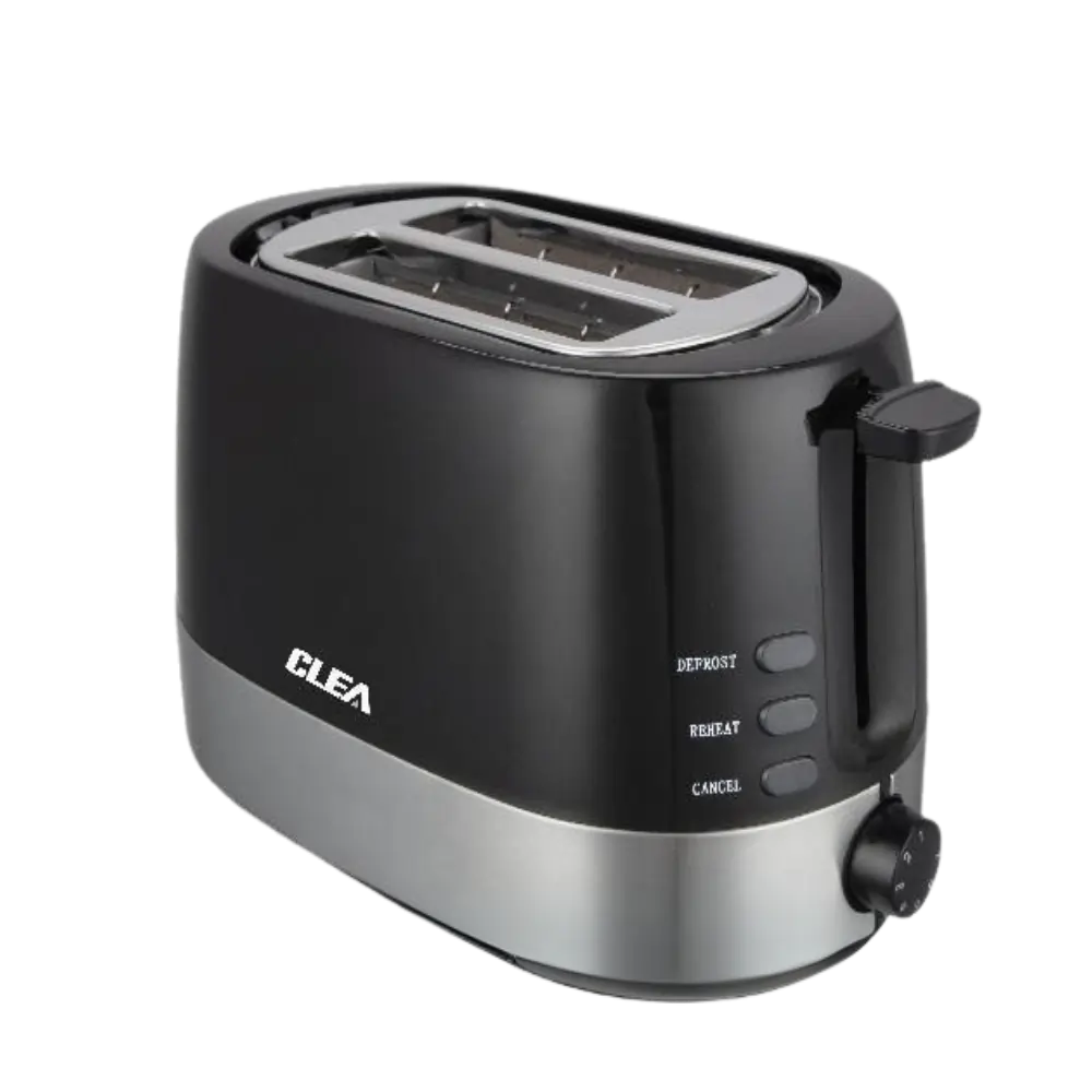 Compact 2-slice toaster with 7 browning levels, one-touch Cancel/Reheat/Defrost, and easy-clean crumb tray.