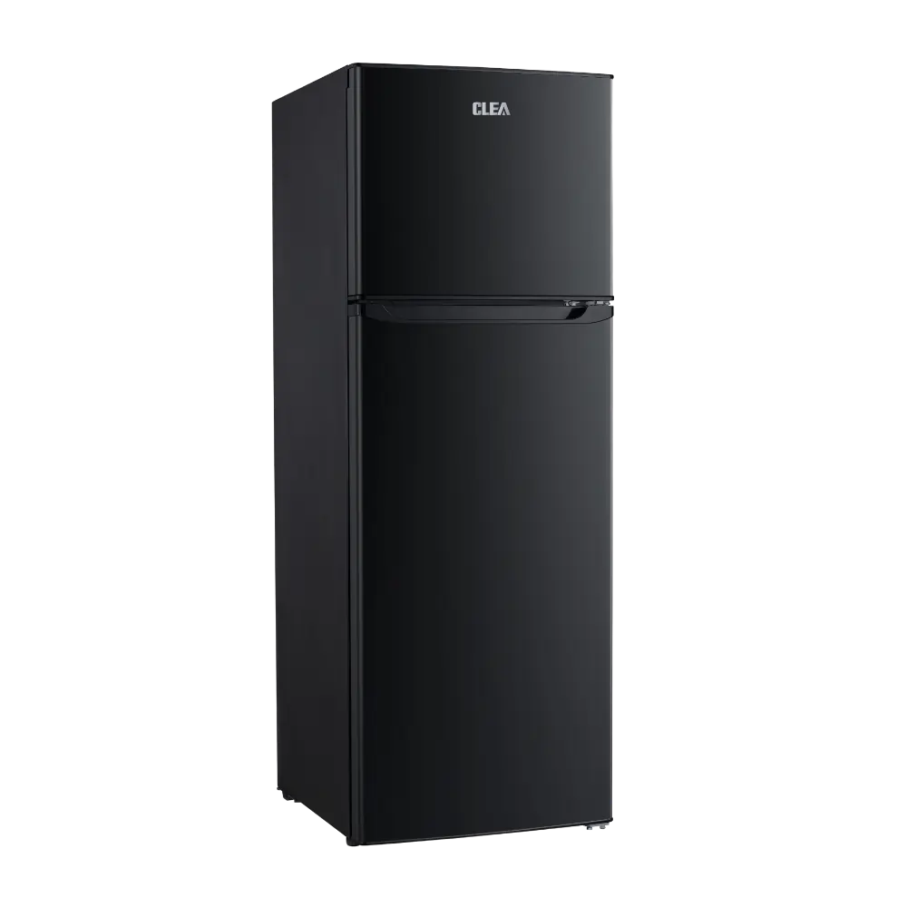 340 liter top-freezer refrigerator with electronic temperature control, reversible door, and adjustable glass storage.