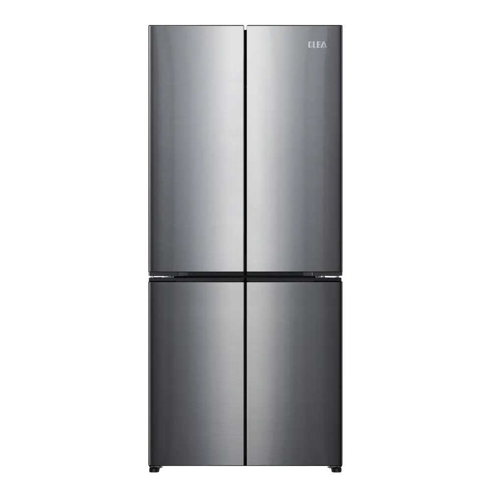 485 liter multi-door fridge with A+ efficiency, smart mode, electronic temperature control, and fast freezing. Adjustable glass storage with a recessed handle.
