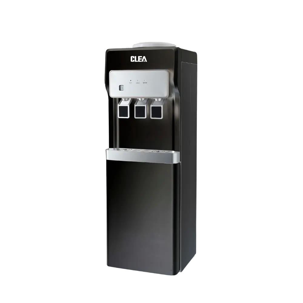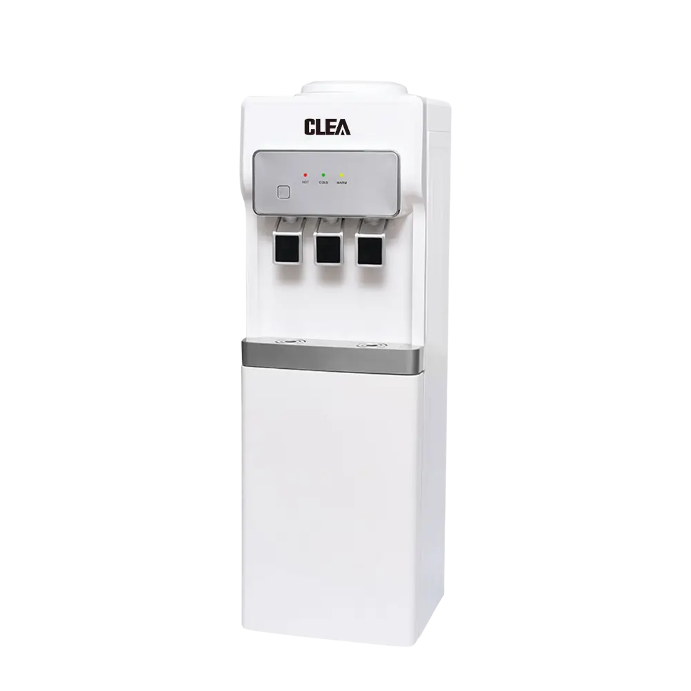 Floor-standing three-faucet dispenser providing hot, cold, and room-temperature water. Fast heating, reliable cooling, compact footprint.