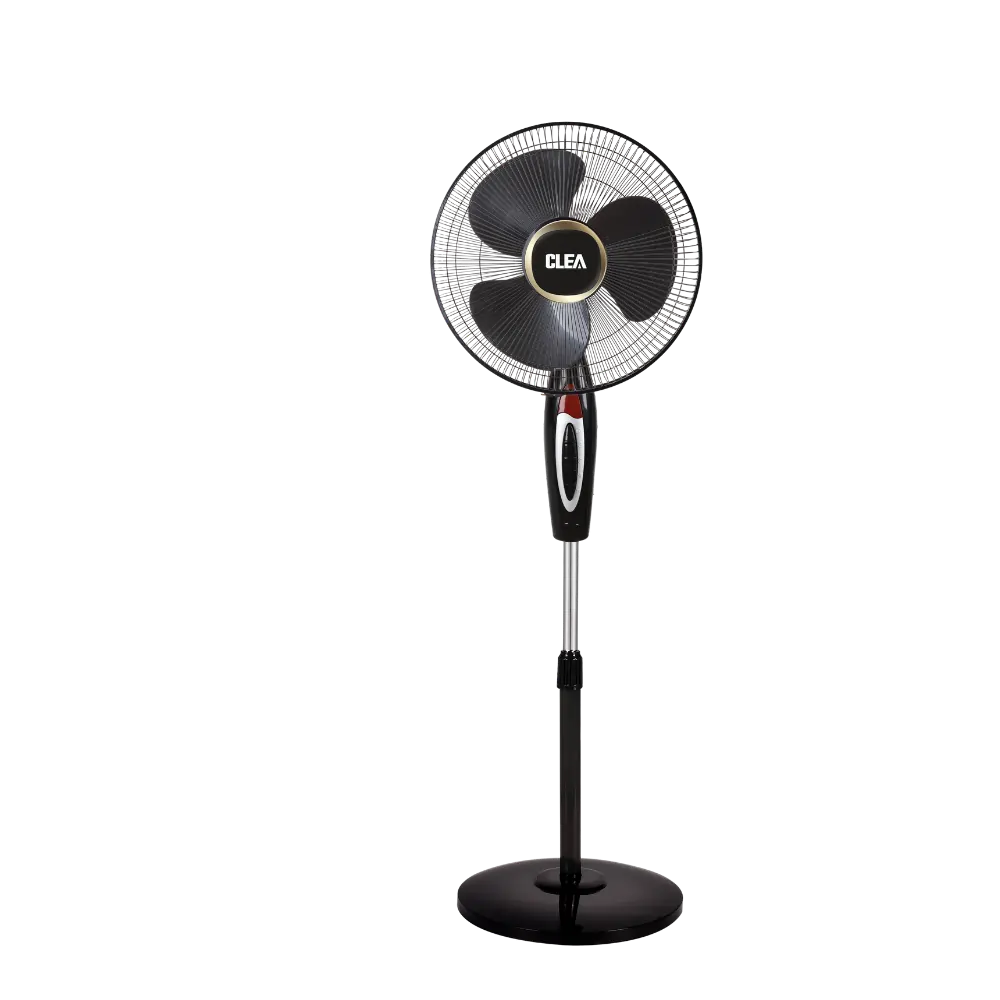 Stylish 16-inch pedestal fan in black with a sturdy round base and efficient aluminum motor. Smooth airflow, low noise, and a slim profile for any room.