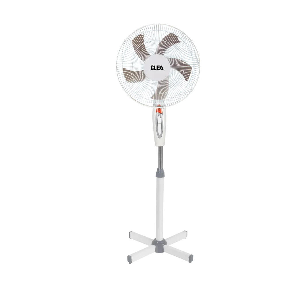Reliable 16-inch pedestal fan with a quiet 45 W aluminum motor and 5-blade design. Stable cross base, protective grill, and clean white finish for home or office cooling.