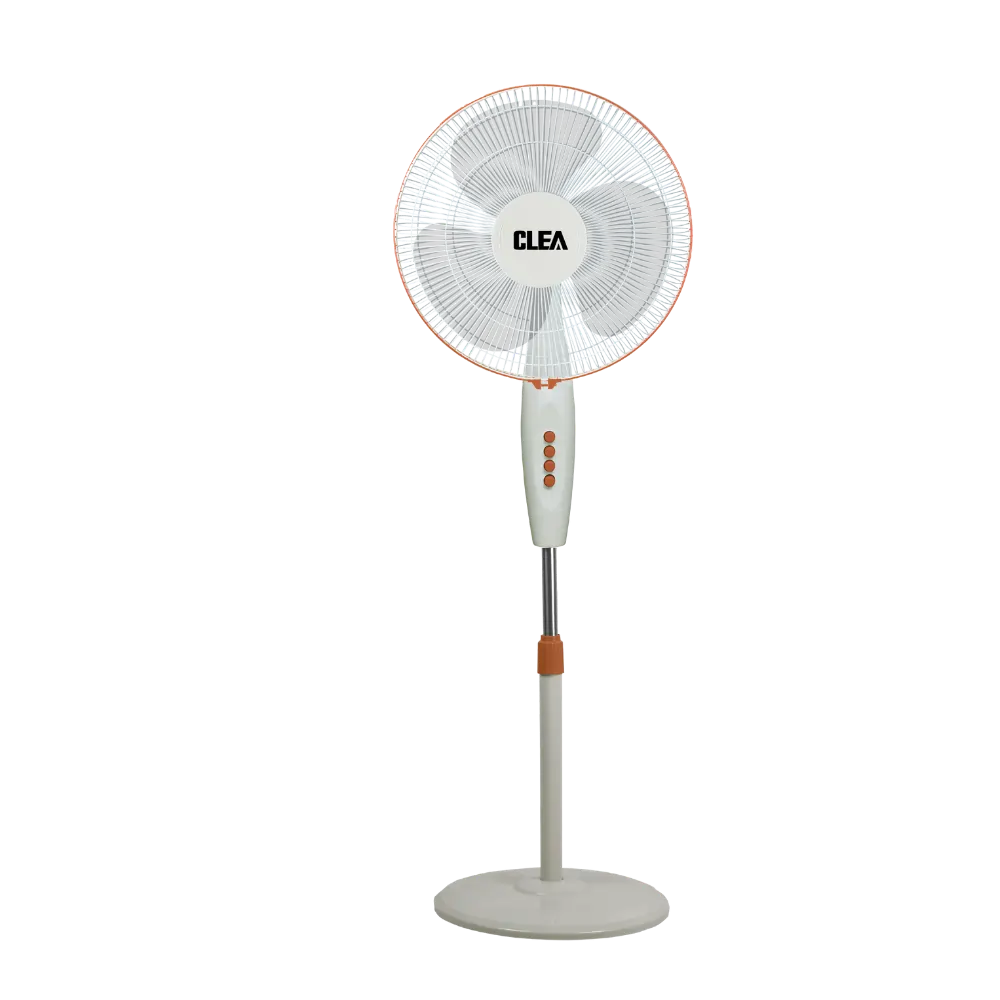 Compact 16-inch pedestal fan with a sturdy round base and efficient 45 W aluminum motor. Three-blade airflow, quiet operation, and a clean white finish for home or office.