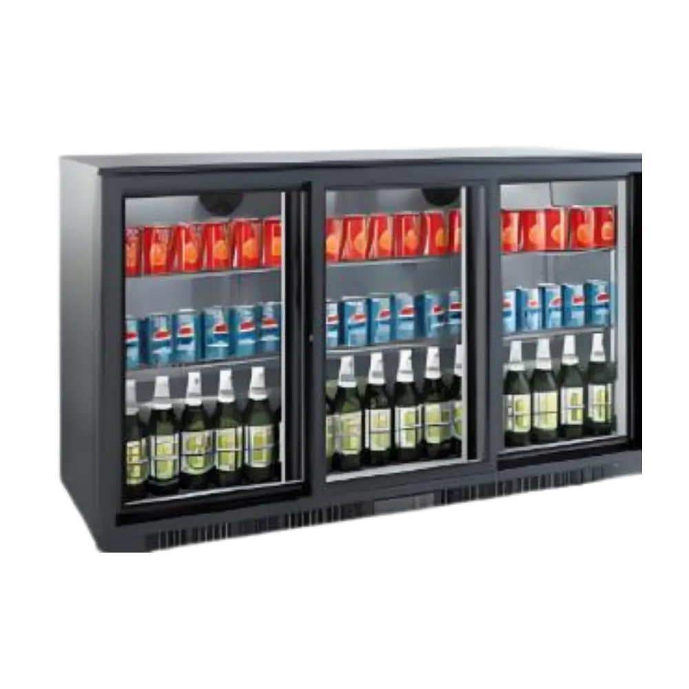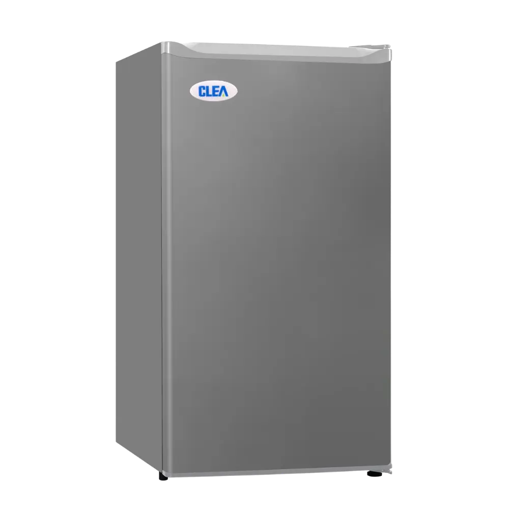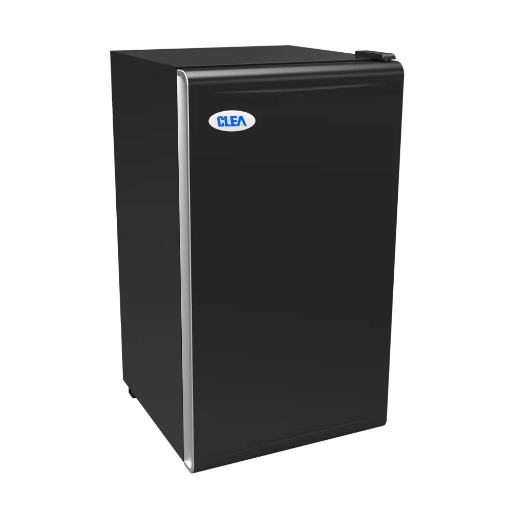 90 liter mini bar fridge in black with recessed handle, door lock, and an internal freezer compartment—compact, secure, and easy to place.