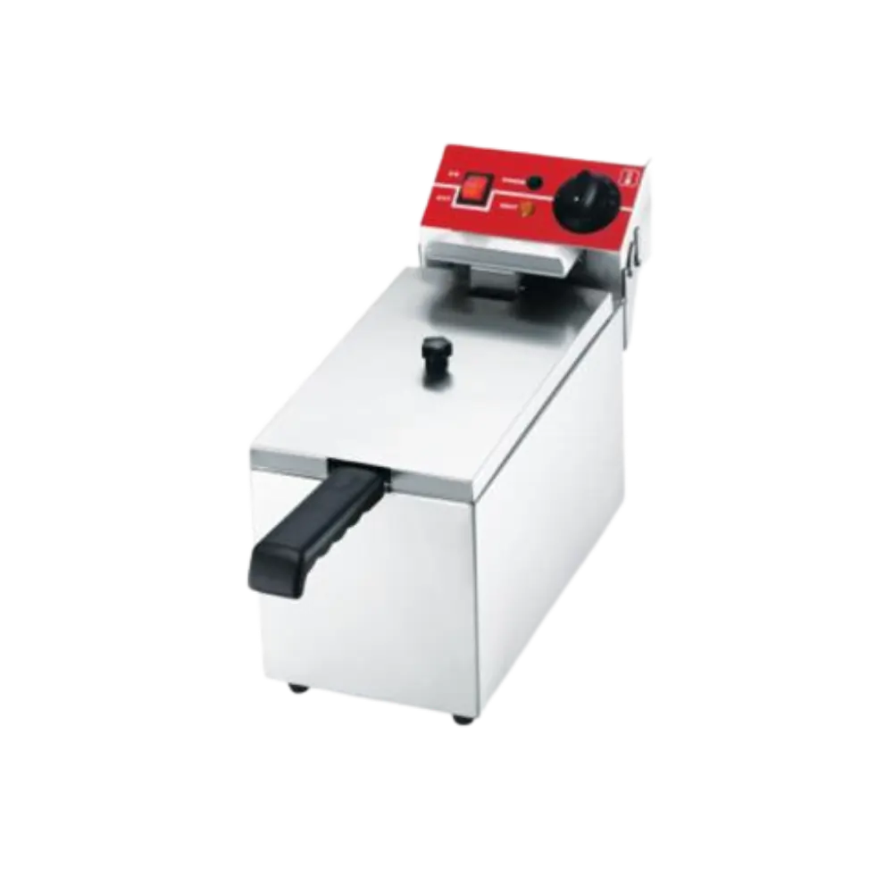 Compact 6-liter fryer with an adjustable 60–200 °C thermostat; 220 V plug-in unit that’s ideal for cafes, kiosks, and food trucks