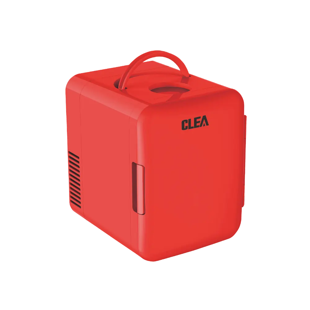 Ultra-compact 4-liter personal fridge for cans and snacks, thermoelectric cooling (8–18 °C), glossy ABS body with removable shelf.