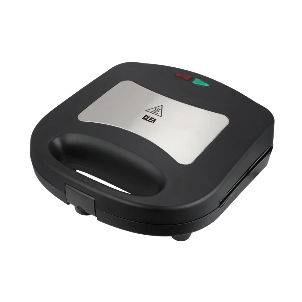 Compact 700W 3-in-1 sandwich maker with interchangeable sandwich, grill, and waffle plates, automatic temperature control, and power/ready indicator lights.